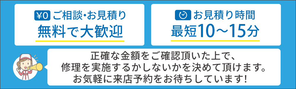 「素人を相手にぼったくらないか。」という不安を抱えつつ、見積もりを依頼しました。他の口コミにもありましたが、スタッフの対応が良く、説明もしっかりしていただきました。