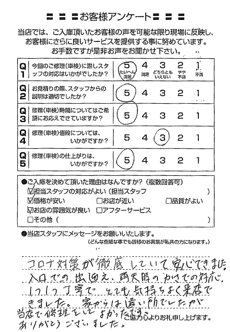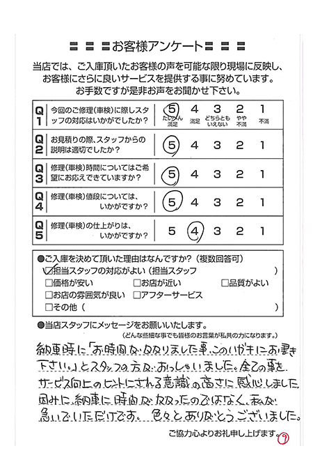 昨年末に駐車場での自損事故で傷つけてしまったのを修理して頂きました。年の瀬で混雑してるだろうから、年内に終わるのは難しいかもしれないと思っていたのですが、とても迅速にしかも丁寧に対応して頂き、年を越さずに完了できて大変ありがたかったです。突然見積りに伺い、しかも迷った挙げ句ほかの販売会社で購入した車だったにもかかわらず、その営業の方は、不快そうな対応どころか逆にとても物腰柔らかく接して下さりありがたかったのと、さすがプロは違うな!と感心いたしました。修理担当の方も、保険か実費かどちらで直すほうがよいかや、修理箇所についての説明などとても親身に説明して頂き、安心してお任せすることができました。