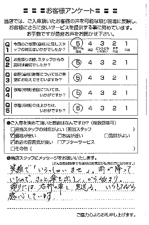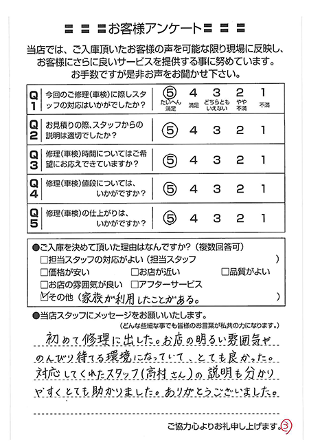 ・他のお店よりも価格も安く、キズも綺麗に修理していただきました。ありがとうございました。【福井開発店】