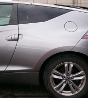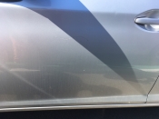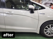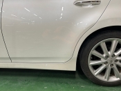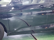 | 左側面、広範囲の修理でした。一番損傷のひどい左Rrドアは、きれいに修理できました。修理後にゆがみが残るかと思いましたが、残らず仕上げることが出来ました。ドアを交換すると高額になりますが、修理をすることで安く修理できました。 |
