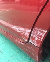 | ご修理ありがとうございます。 左リアドアの下の方というのは運転者からするとまさに死角といっても過言ではないですよね。今回はその死角に潜んでいたブロックにこすってしまった修理になります。相手が硬いブロックということもあり、深くえぐれて凹んでしまいましたが、鈑金塗装で、すき間、まっ平な面、もちろんサビもキレイに直りました。 |