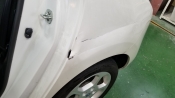 | 修理担当者のコメント | 今回の修理事例は、フェンダー取替(タイヤの上のパネル)とドアのヘコミ修理になります。 ドアのヘコミは内側から押し出すことができない為、新品のフェンダーの高さに合わせながら外側から引き出して修理します。 ドアは2枚合わせの鉄板で作られています。今回の損傷のように縁の部分を引き出しすると鉄板のつなぎ目のシーラーが剥がれてしまい、隙間が開いて水漏れの原因になってしまう為、なるべくシーラーが剥がれないように慎重に作業を行います。 今回のように損傷が大きい場合でも修理可能な場合がありますので、まずはお気軽にご相談ください!! |
