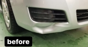 | 今回は、大雪のときに雪の塊にあたって変形してしまったバンパーの修理です。修理と言っても実は、塗装をしていないのです! バンパーを熱処理をしてから軟らかくして裏から押し出した修理となります。時間は1時間30分ほどで出来上がります。気になるバンパーのヘコミがあるなら一度ご相談ください! |